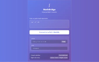 MathBridge - Универсальный математический конвертер является расширением для Chrome, разработанным для упрощения преобразования математических выражений в форматы LaTeX и MathML. Этот инструмент предназначен для различных пользователей, включая студентов, преподавателей и исследователей, предоставляя бесшовную функциональность для преобразования математических выражений в обычном тексте, изображений и даже рукописных уравнений. С помощью одного клика пользователи могут преобразовать сложные выражения, такие как `∫₀¹ x² dx`, в более удобный формат, такой как `\frac{1}{2} x^2`.